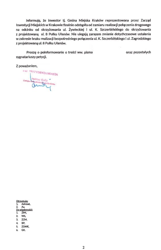 2021-05-11 10:42:11Szanowni Państwo, chcielibyśmy podzielić się z Państwem oficjalnym pismem wiceprezydenta Andrzeja Kuliga które jest jednocześnie odpowiedzią na nasze działania w sprawie. Jeszcze raz serdecznie dziękujemy za Państwa wsparcie.