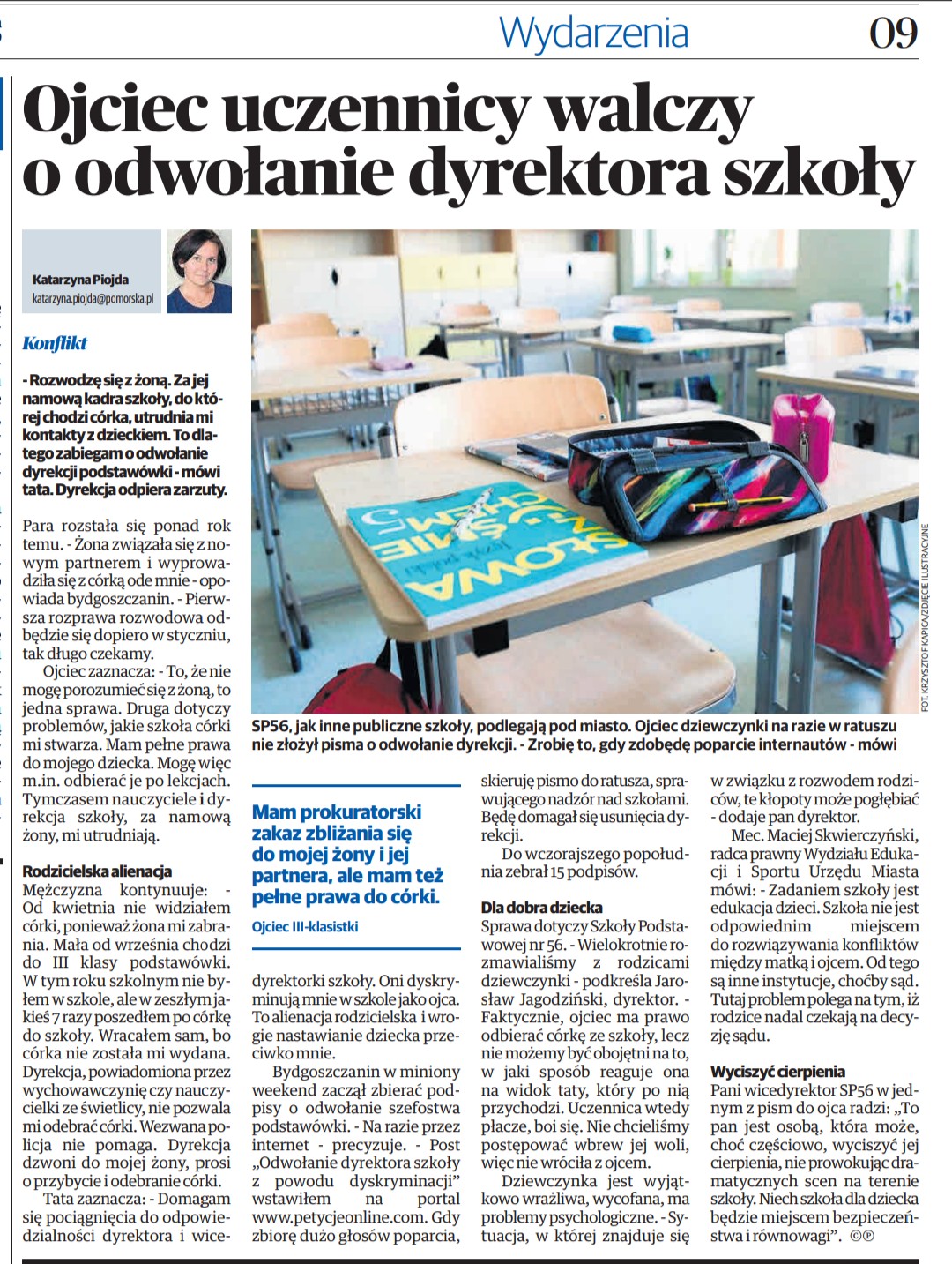W świetle powyższego dyrektor SP 56 w Bydgoszczy swoimi rażącymi działaniami względem małoletniej, naruszył i nadal narusza wszelkie możliwe standardy ochrony praw dziecka, a przede wszystkim art. 5 i art. 9 Konwencji o Prawach Dziecka, gdzie wyrażono, że: „Państwa-Strony będą szanowały odpowiedzialność, prawo i obowiązek rodziców (....). W art. 9 podkreślono, że: „1. Państwa -Strony zapewnią, aby dziecko nie zostało oddzielone od swoich rodziców wbrew ich woli (...). 3. Państwa-Strony będą szanowały prawo dziecka odseparowanego od jednego lub obojga rodziców do utrzymywania regularnych kontaktów z obojgiem rodziców”.