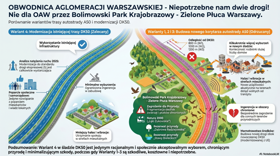 Wyrażamy stanowczy sprzeciw wobec realizacji wariantów 1, 2 i 3 projektowanej Obwodnicy Aglomeracji Warszawskiej (A50/S50), w szczególności na terenie gmin Radziejowice, Puszcza Mariańska i Wiskitki, oraz wnosimy o wykorzystanie i rozbudowę istniejącej infrastruktury tj. drogi krajowej DK50.