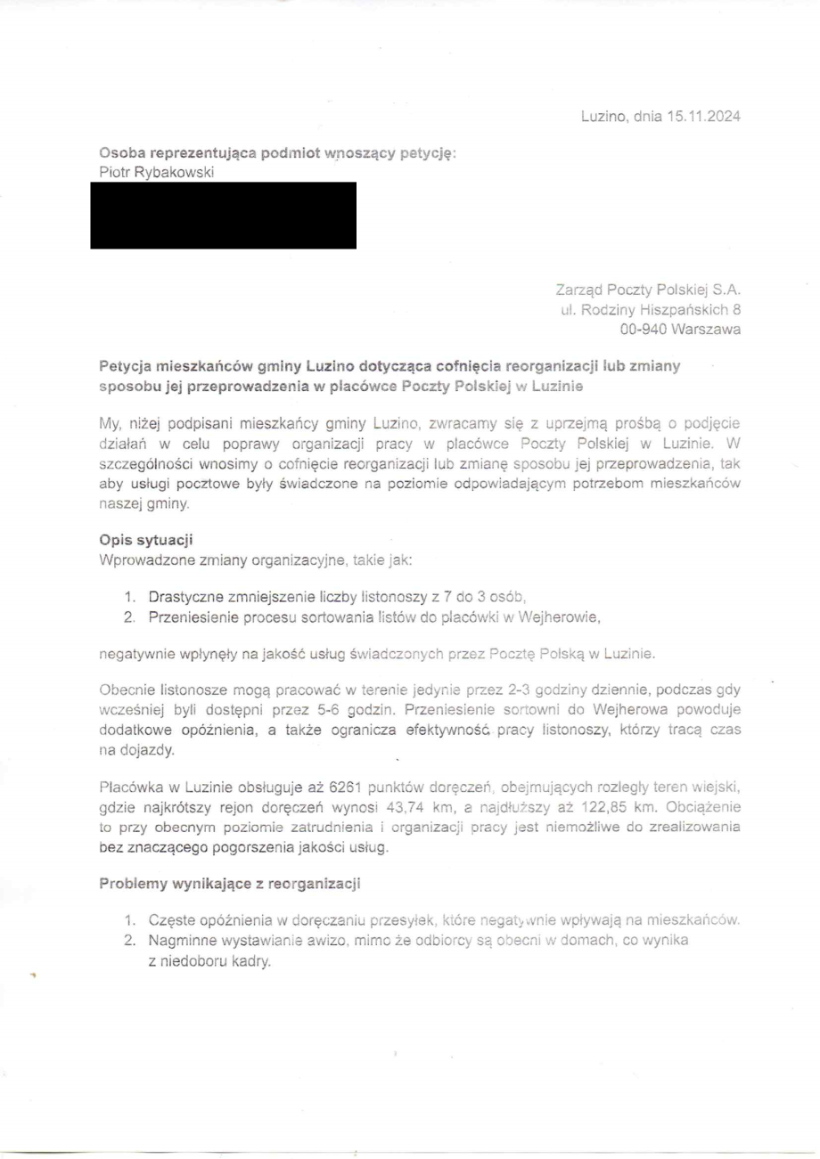 Petycja mieszkańców gminy Luzino dotycząca cofnięcia reorganizacji lub zmiany sposobu jej przeprowadzenia w placówce Poczty Polskiej w Luzinie