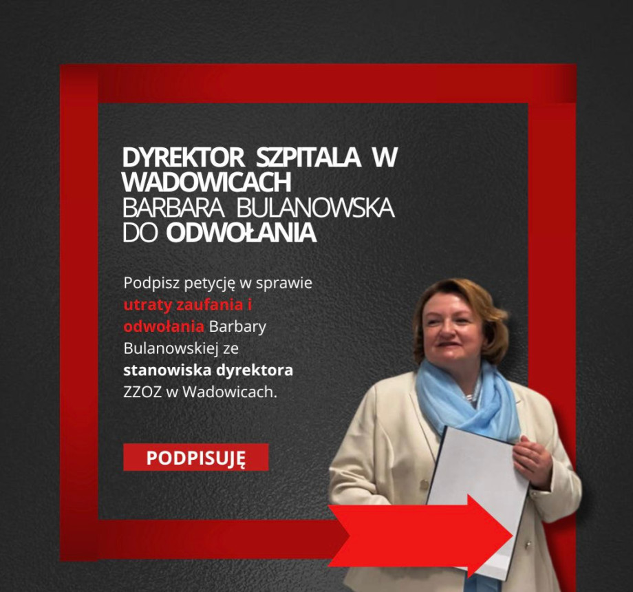 Petycja o odwołanie Dyrektor Bulanowskiej ze stanowiska Dyrektora Szpitala w Wadowicach.