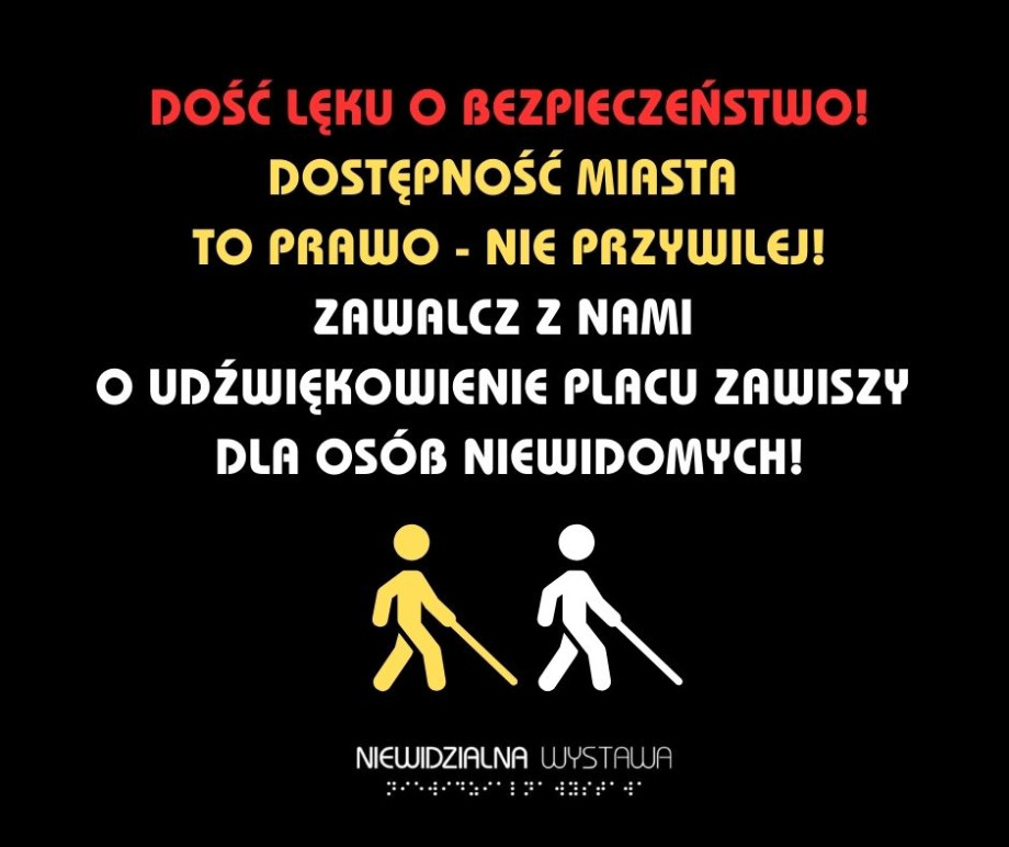 Od 9 lat piszemy pisma do decydentów w sprawie udźwiękowienia sygnalizacji świetlnej. Za każdym razem odbijamy się od ściany, słysząc o mitycznym "generalnym remoncie" tego obszaru. Kilka miesięcy temu Plac Zawiszy był remontowany, ale... sygnalizacja świetlna wciąż pozostaje nieudźwiękowiona. Sprawa rozbija się najpewniej o pieniądze, ale dla nas to argument nie do przyjęcia. Dlaczego? Ponieważ już kilka razy osoby niewidome z naszego zespołu były o przysłowiowy włos od tragedii. Nie chcemy, aby udźwiękowienie tego miejsca stało się faktem dopiero po nagłówkach w mediach: "Niewidomy zabity przez tramwaj / autobus / samochód na warszawskim Placu Zawiszy". Chcemy czuć się bezpiecznie!