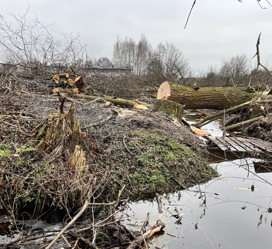 Właściciele mają swoje prawa. Nikt tego nie neguje. Jednak gdzieś w pogoni za zyskiem zagubiło się nie tylko poczucie wspólnoty i zdrowego rozsądku, ale też przyzwoitości. Właściciele źli na to, że mieszkańcy chcą ocalić bardzo cenny przyrodniczo teren stwierdzili otwarcie, że wycinają złośliwie, więcej niż potrzebują. Zagłada przyrody dokonała się w sposób doprawdy barbarzyński. Mimo apeli mieszkańców i ekologów właściciele nie mieli względu na nic: na sarny, bobry, ptaki i mieszkających tu ludzi. Zniszczyli ekosystem, który tworzył mikroklimat i stabilizował brzegi. Wyrżnięto także drzewa rosnące nad samą wodą. A przecież nawet dawni prości chłopi zawsze zostawiali na miedzach drzewa, które dawały owoce i cień. Tu mówimy nie o prymitywnych ludziach ale, o ironio, o właścicielce działki, która uczyła dzieci geografii w naszej szkole. Co najbardziej niepokojące, właściciele otrzymali na to zgodę władz gminy a prawo było interpretowane bardzo jednostronnie. Żerowisko bobrów w okresie ochronnym stratowano bez koniecznego zezwolenia od Regionalnej Dyrekcji Ochrony Środowiska, na co mamy dowody oraz ekspertyzę specjalisty.