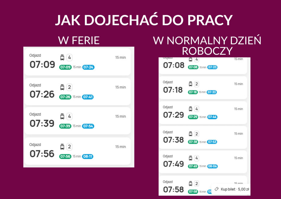 dostosowanie oferty przewozowej MZK do rzeczywistych potrzeb osób pracujących, a nie wyłącznie do kalendarza szkolnego.